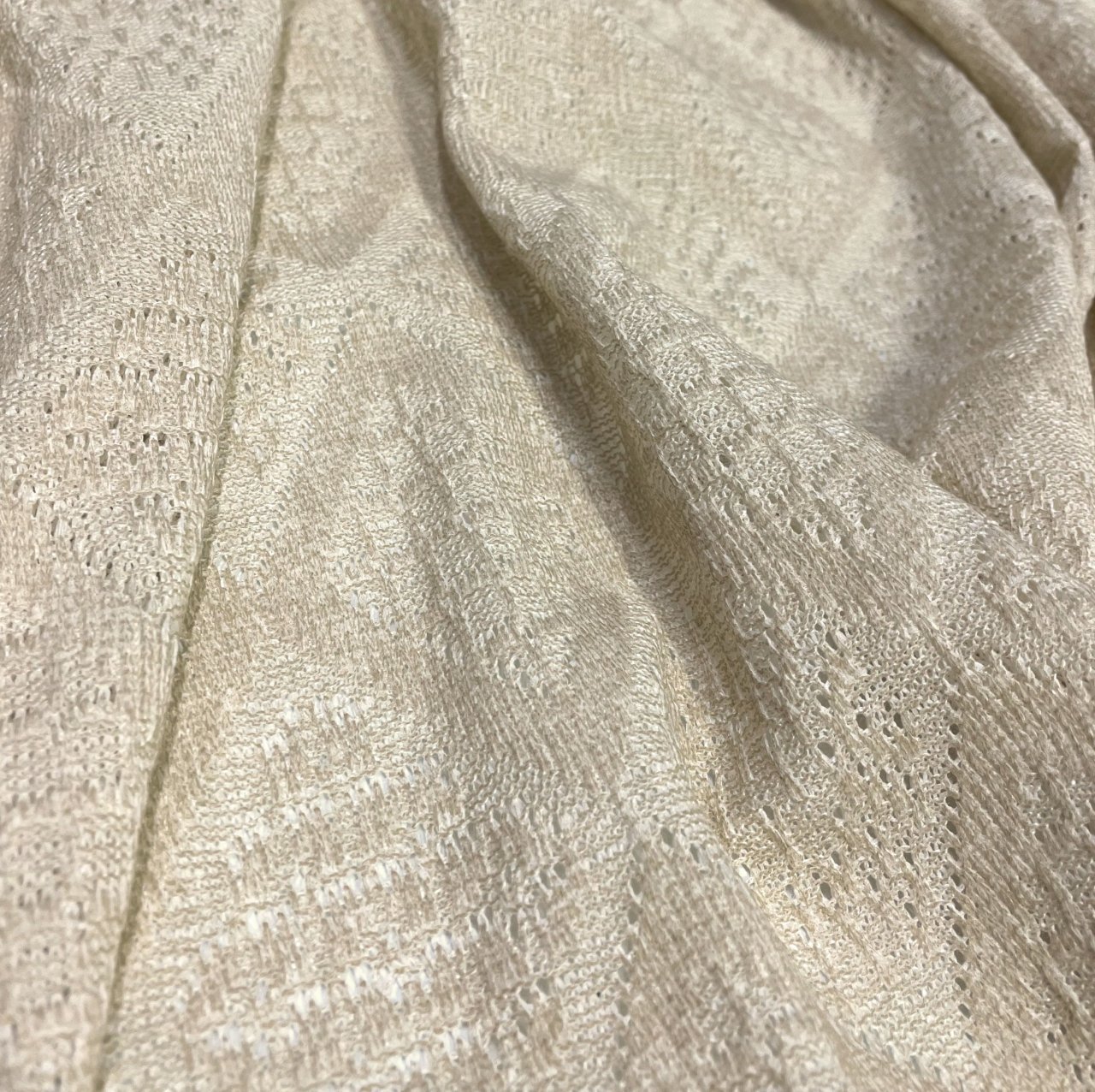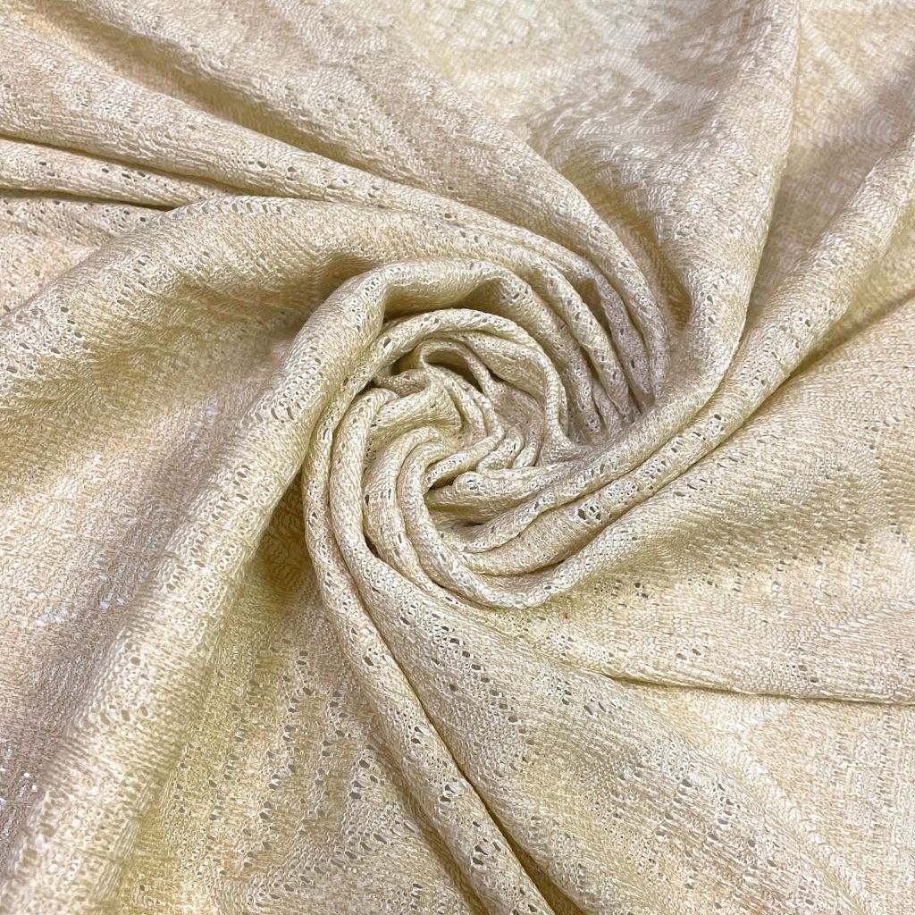 Мягкое трикотажное полотно ажурной машинной вязки.. Одежда из этой ткани может быть просторной в спортивном стиле и облегающей подчеркивая достоинства фигуры. Всесезонные сарафаны, брюки, туники будут прекрасно смотреться. Стирка в машинке на 30 градусов, ручной режим
